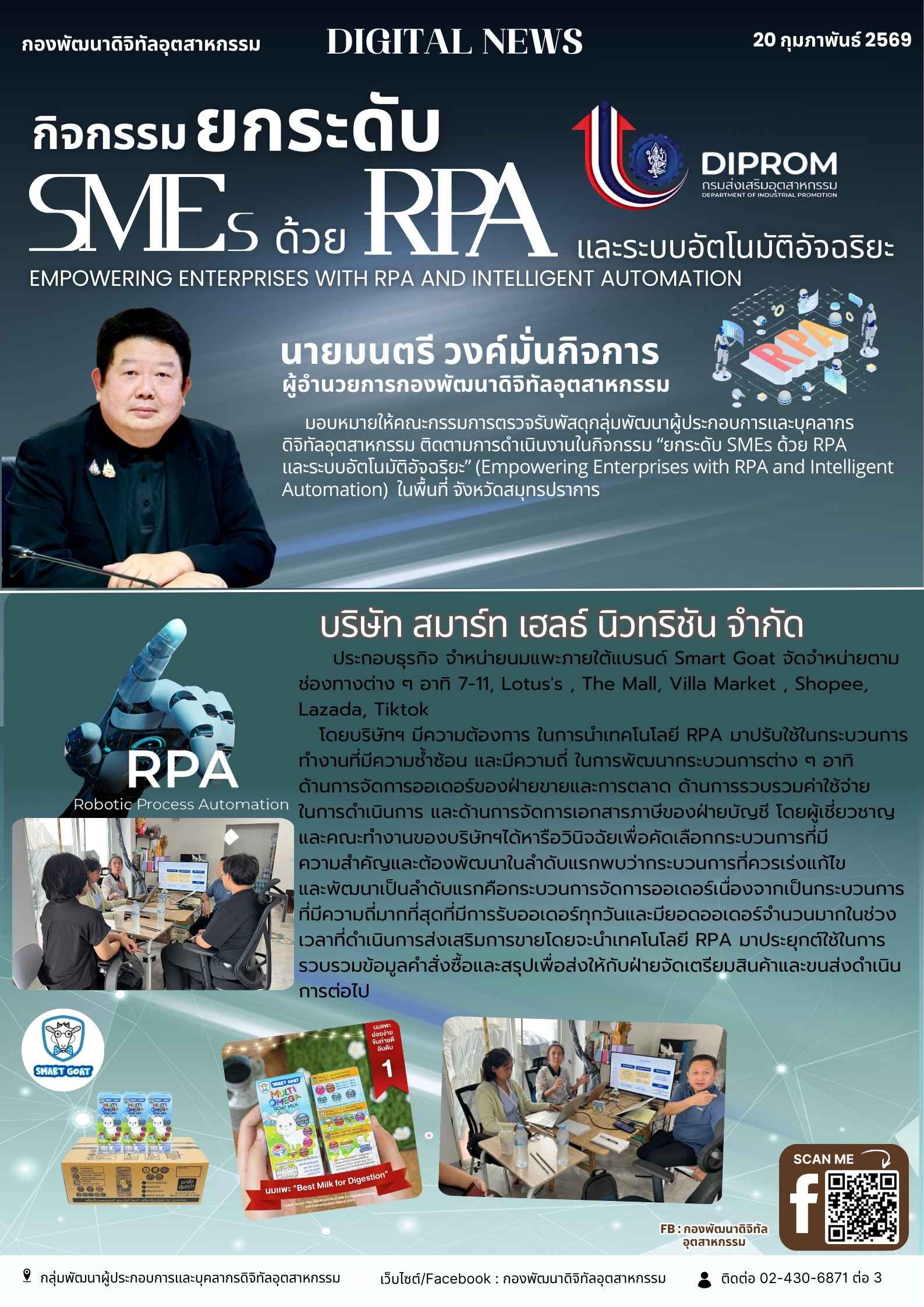 มอบหมายให้คณะกรรมการตรวจรับพัสดุกลุ่มพัฒนาผู้ประกอบการและบุคลากรดิจิทัลอุตสาหกรรม ติดตามการดำเนินงานในกิจกรรม “ยกระดับ SMEs ด้วย RPA และระบบอัตโนมัติอัจฉริยะ” Empowering Enterprises with RPA and Intelligent Automation