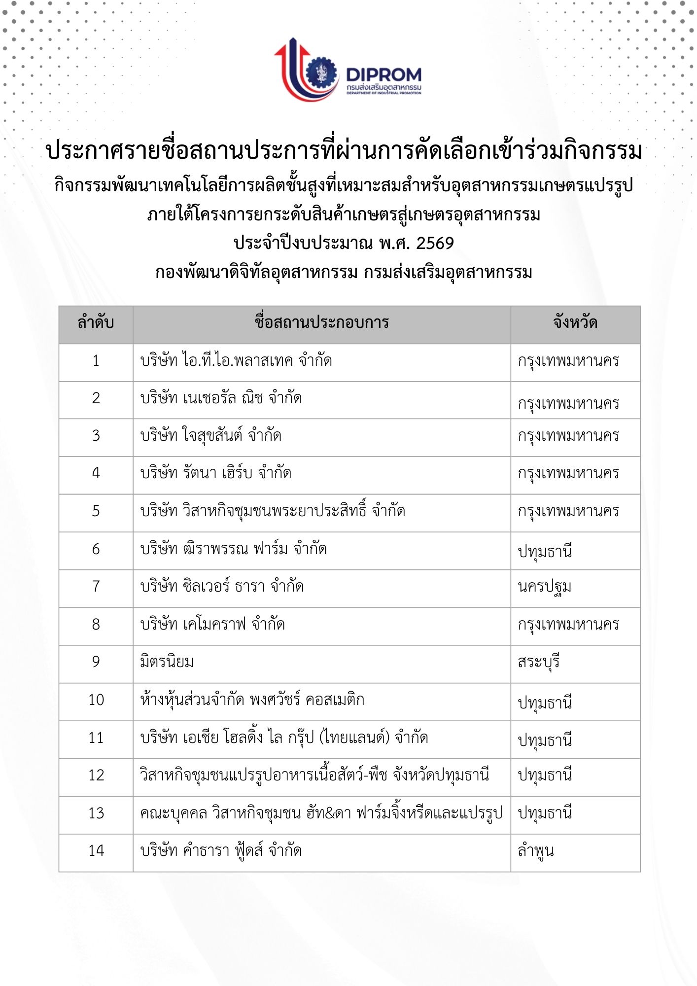 ประกาศรายชื่อสถานประกอบการที่ผ่านการคัดเลือกเข้าร่วม "กิจกรรมพัฒนาเทคโนโลยีการผลิตชั้นสูงที่เหมาะสมสำหรับอุตสาหกรรมเกษตรแปรรูป ประจำปีงบประมาณ พ.ศ. 2569