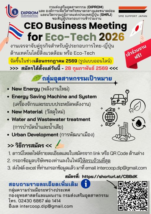 ขอเชิญผู้ประกอบการไทยเข้าร่วม งานเจรจาจับคู่ธุรกิจออนไลน์ CEO Business Meeting for Eco-Tech 2026 เพื่อเพิ่มโอกาสในการขยายธุรกิจสู่สากล