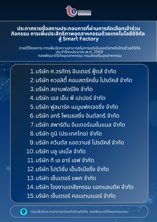 ประกาศรายชื่อสถานประกอบการที่ผ่านการคัดเลือกเข้าร่วมกิจกรรมการเพิ่มประสิทธิภาพอุตสาหกรรมด้วยเทคโนโลยีดิจิทัล สู่ Smart Factory ประจำปีงบประมาณ พ.ศ. 2569" ครั้งที่ 1