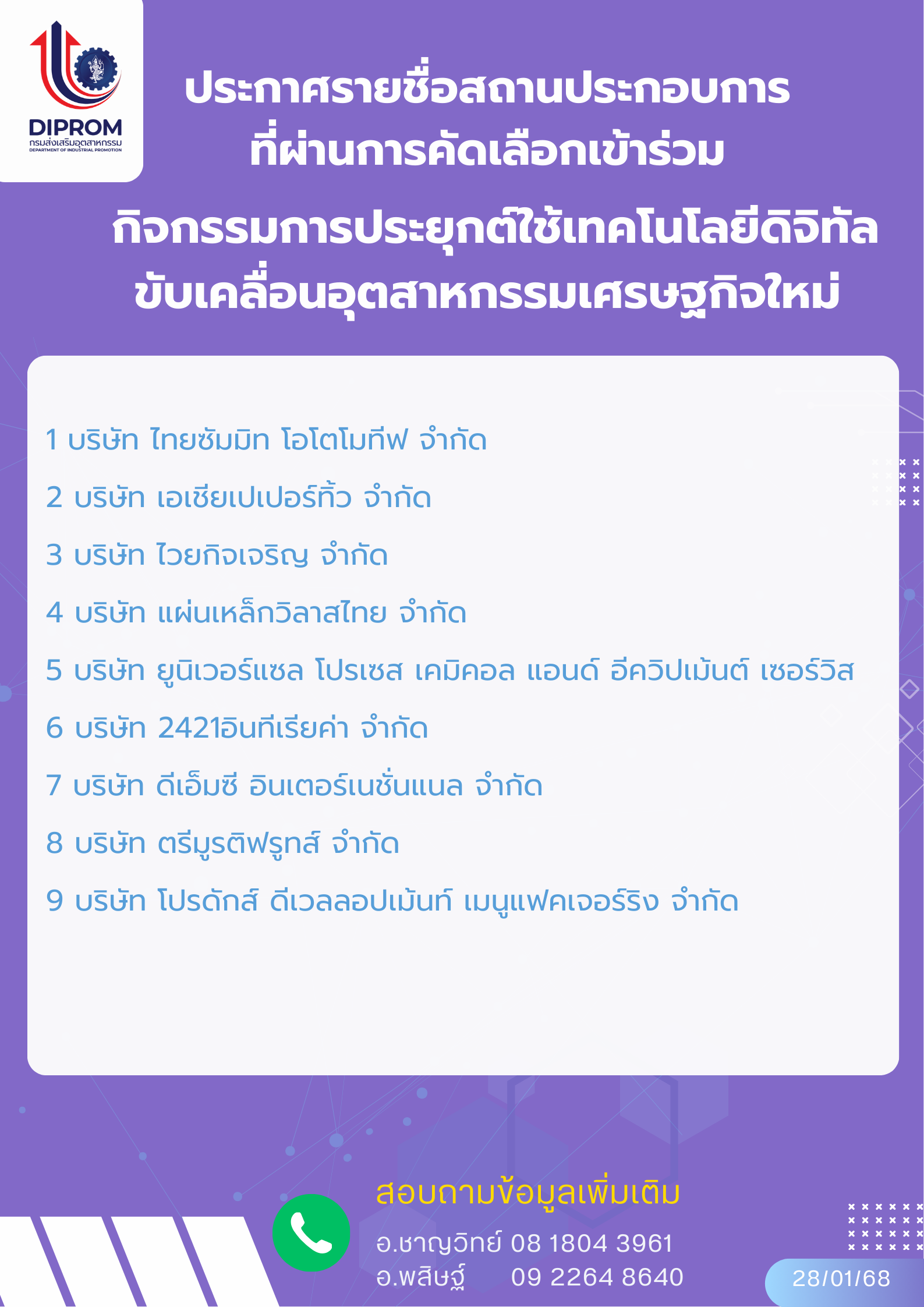 ประกาศรายชื่อสถานประกอบการที่ผ่านการคัดเลือกเข้าร่วมกิจกรรมการประยุกต์ใช้เทคโนโลยีดิจิทัลขับเคลื่อนอุตสาหกรรมเศรษฐกิจใหม่ ประจำปีงบประมาณ พ.ศ. 2569 ครั้งที่ 2