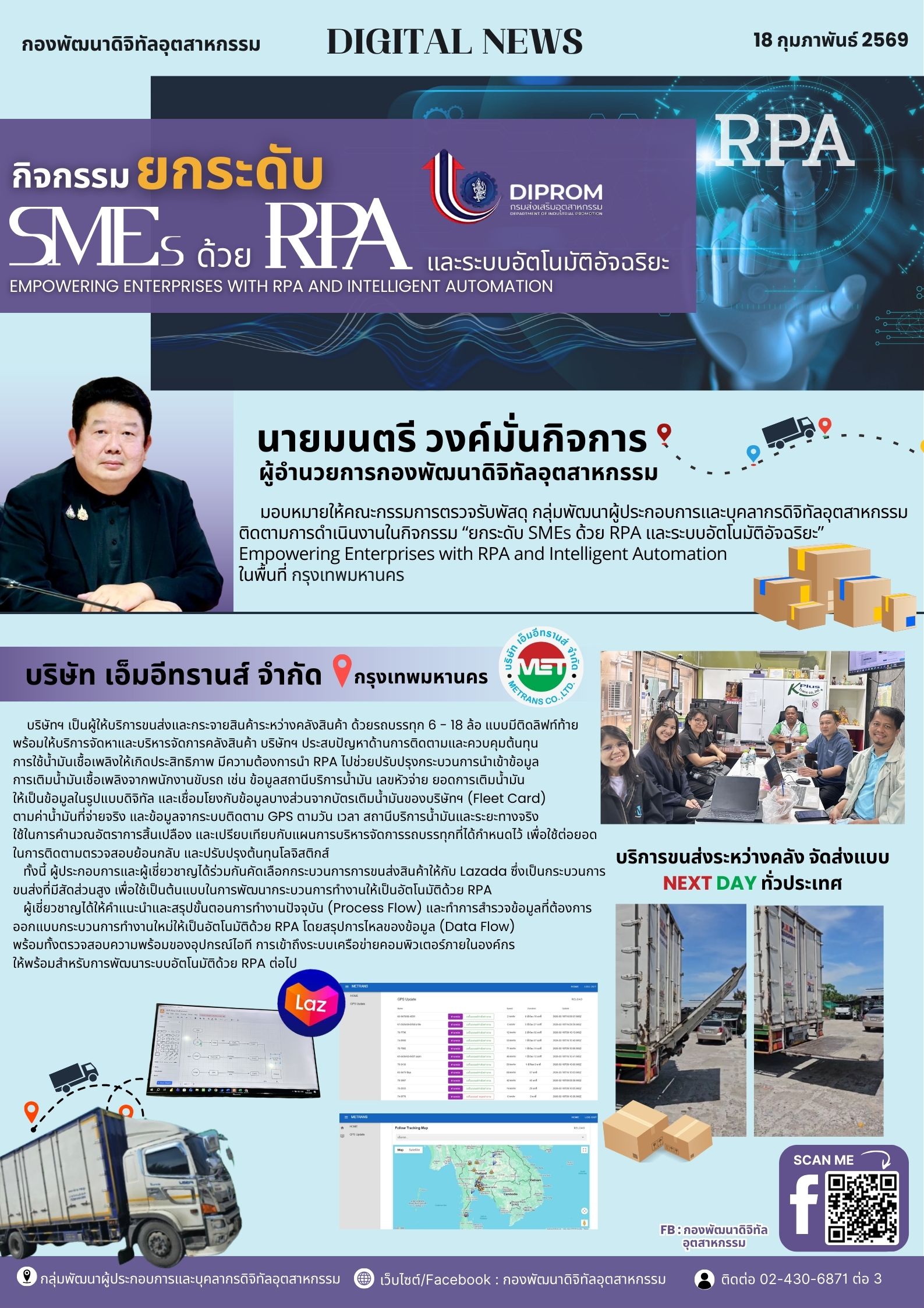มอบหมายให้คณะกรรมการตรวจรับพัสดุ กลุ่มพัฒนาผู้ประกอบการและบุคลากรดิจิทัลอุตสาหกรรม ติดตามการดำเนินงานในกิจกรรม “ยกระดับ SMEs ด้วย RPA และระบบอัตโนมัติอัจฉริยะ” Empowering Enterprises with RPA and Intelligent Automation ในพื้นที่ กรุงเทพมหานคร