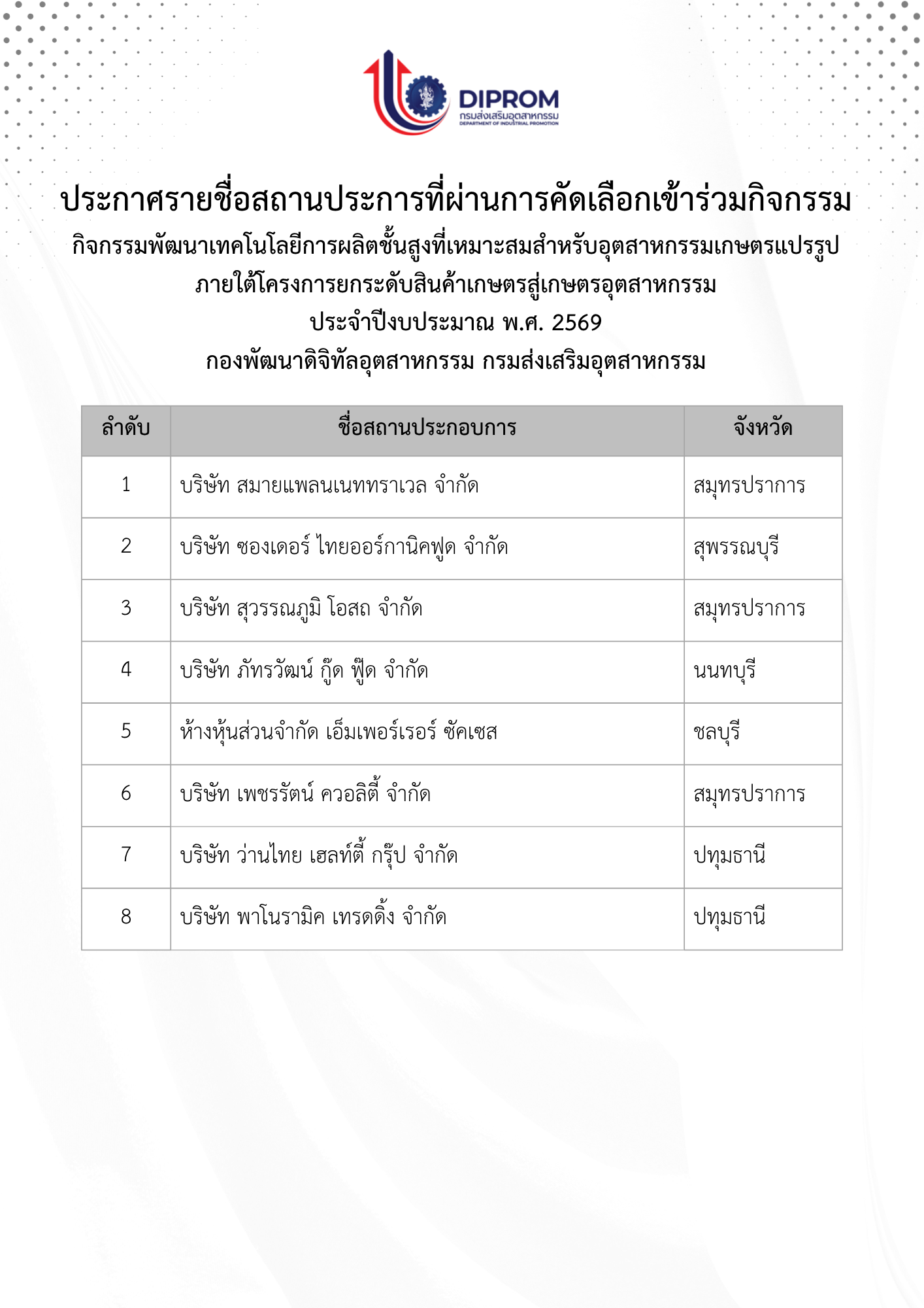 📣❗ประกาศรายชื่อสถานประกอบการที่ผ่านการคัดเลือกเข้าร่วมกิจกรรมพัฒนาเทคโนโลยีการผลิตชั้นสูงที่เหมาะสมสำหรับอุตสาหกรรมเกษตรแปรรูป ประจำปีงบประมาณ พ.ศ. 2569 จำนวน  8 กิจการ