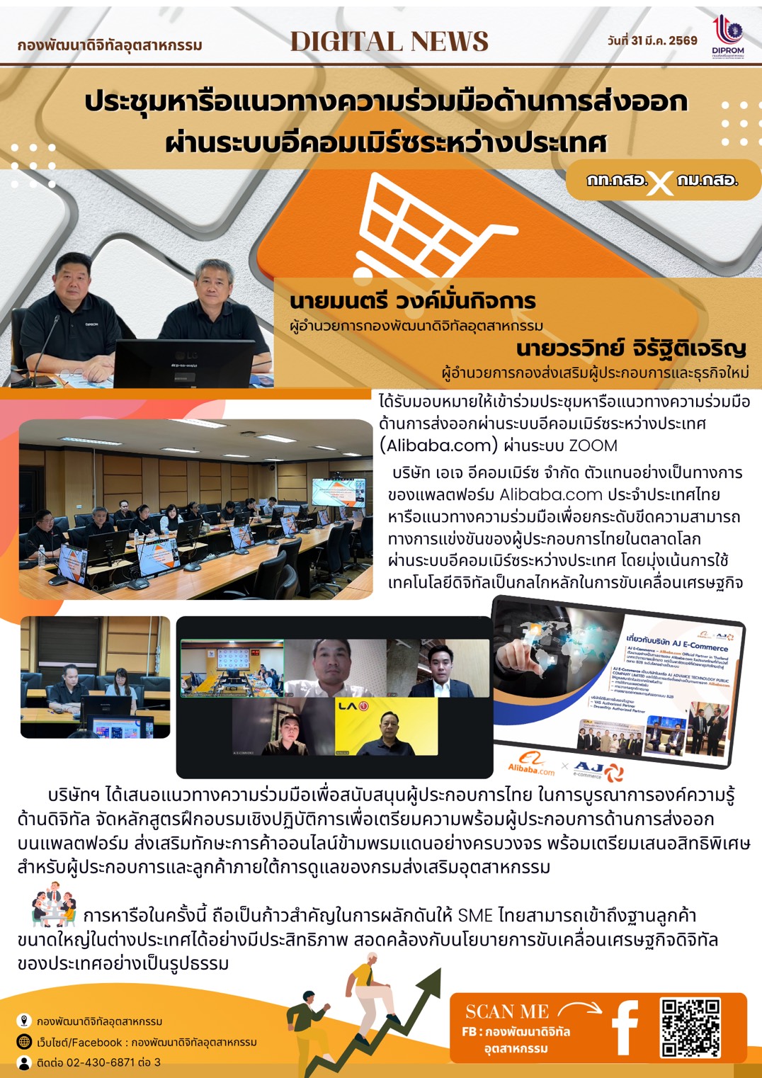 บริษัท เอเจ อีคอมเมิร์ซ จํากัด ตัวแทนอย่างเป็นทางการของแพลตฟอร์ม Alibaba.com ประจําประเทศไทยหารือแนวทางความร่วมมือเพื่อยกระดับขีดความสามารถทางการแข่งขันของผู้ประกอบการไทยในตลาดโลกผ่านระบบอีคอมเมิร์ซระหว่างประเทศโดยมุ่งเน้นการใช้เทคโนโลยีดิจิทัลเป็นกลไกหลักในการขับเคลื่อนเศรษฐกิจ