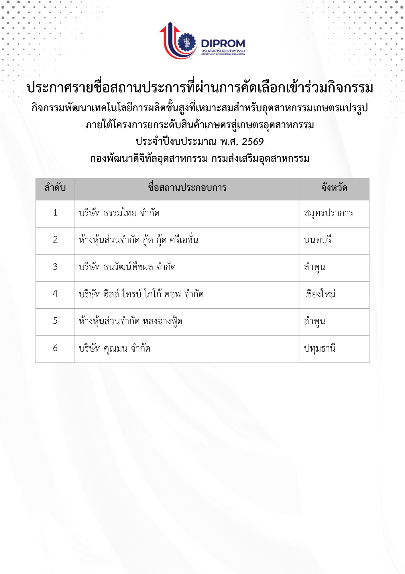 ประกาศรายชื่อสถานประกอบการที่ผ่านการคัดเลือกเข้าร่วมกิจกรรมพัฒนาเทคโนโลยีการผลิตชั้นสูงที่เหมาะสมสำหรับอุตสาหกรรมเกษตรแปรรูป ประจำปีงบประมาณ พ.ศ. 2569